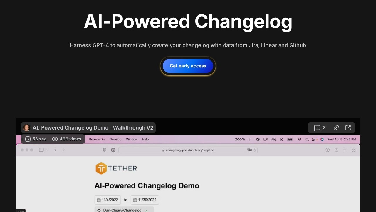 The AI-Driven Changelog by Tether is a utility that automatically generates changelogs by utilizing data from Jira, Linear, and Github. It integrates with these platforms to gather product development information, allowing the AI to create the changelog. It can be tailored to your needs and published with a single click, and users have the opportunity to gain priority access through Early Bird pricing.