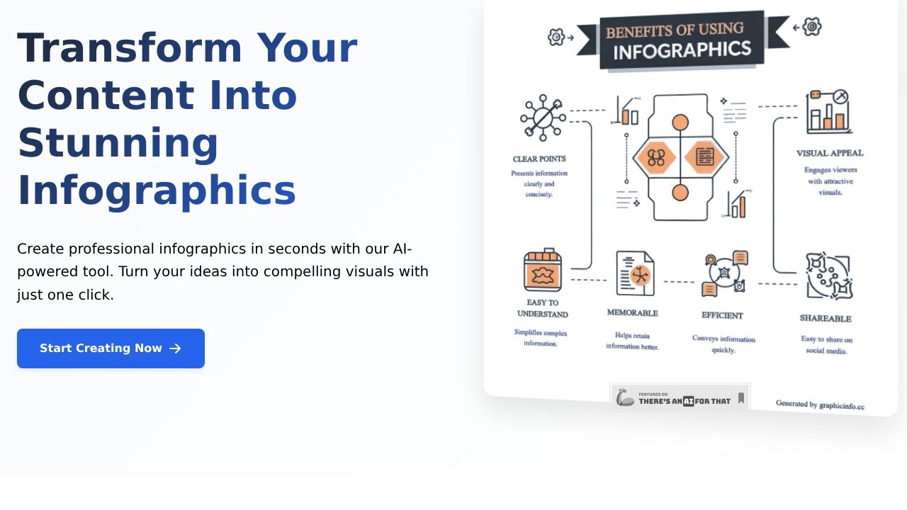 GraphicInfo.cc is an intuitive tool that converts text into attractive infographics with a single click. By utilizing artificial intelligence, it condenses content, picks suitable icons, and selects pertinent images to produce professional infographics rapidly and effectively. This tool is perfect for content creators, marketers, educators, and businesses seeking to enrich their content with captivating visuals without needing advanced design skills. It provides time-saving benefits, user-friendliness, and high-quality results, making it a beneficial asset for those aiming to enhance their content's visual appeal and audience engagement.