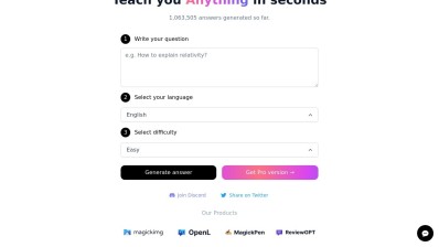 The Teach Anything tool is an educational resource that enables users to swiftly receive answers to their inquiries by choosing a language, setting a difficulty level, and composing a question.