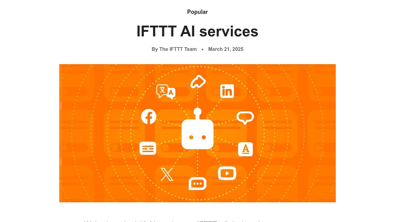 IFTTT has introduced new AI services such as AI Social Creator, AI Content Creator, AI Summarizer, and AI Prompt to enhance content creation and management tasks. These tools automate the process of posting on social media, drafting and outlining blog posts, summarizing content like blog articles or meeting notes, and generating responses to various prompts, thereby significantly improving productivity and efficiency. They are particularly beneficial for content creators, marketers, and professionals who aim to save time and bolster their digital presence. Furthermore, the IFTTT ChatGPT plugin available for ChatGPT Plus subscribers allows for deeper integration of these features into IFTTT's extensive range of services, providing additional flexibility and automation options.