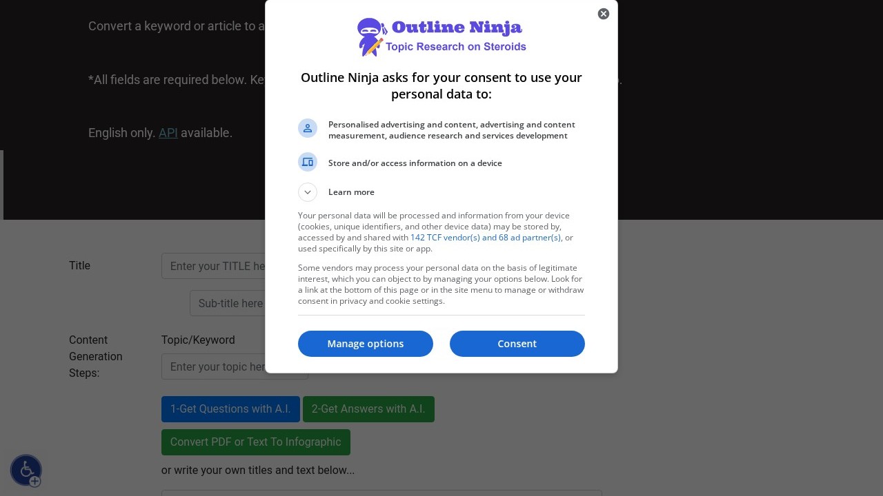 The Infographic Ninja tool is an AI-powered automated infographic creator. It transforms a keyword into an infographic and needs a keyword and title to produce the additional content. This tool is included in the suite of products offered by Outline Ninja.