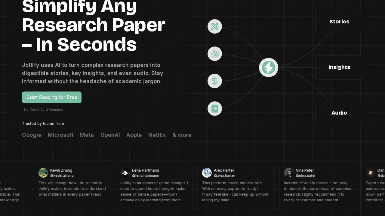 Jotlify is an online platform designed to convert elaborate research papers into user-friendly and captivating stories, insights, and audio formats, making it easier for students, researchers, professionals, and the general public to comprehend. It acts as a link between intricate academic material and those wishing to understand the core of research without being overwhelmed by jargon and complexities. Users may choose Jotlify to streamline their learning and research experience, boost personal development, or remain competitive by utilizing the latest discoveries in their field. With features such as AI-driven explanations, audio versions of papers, advanced search options, and the capability to upload and analyze personal documents, Jotlify provides a thorough solution for anyone seeking to access and simplify the extensive knowledge found in academic research.