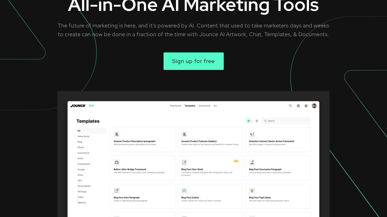 Jounce is a copywriting tool enhanced by AI, designed to support marketers, small business owners, and content creators in swiftly producing professional and impactful content. It offers numerous customizable templates, a document editor powered by AI, dark mode, the ability to add unlimited team members, and more than 70 marketing templates. It assists in creating blog outlines, social media updates, emails, website content, product descriptions, advertising copy, headlines, and campaign strategies.