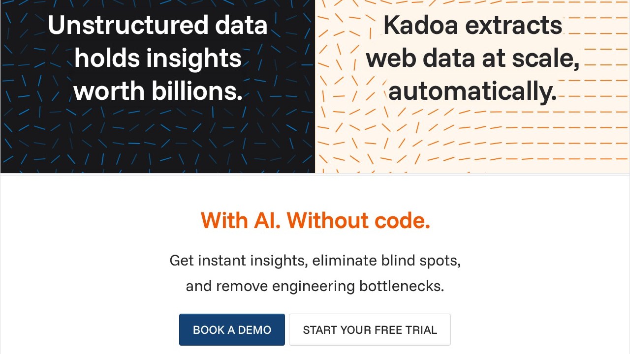 Kadoa is an AI-driven tool that enables users to swiftly extract data from websites, PDFs, and databases within seconds. It removes the necessity for coding custom scrapers and provides unimpeded access to data. Additionally, it offers a robust API and integrations for straightforward access and utilization of the extracted data. Kadoa is applicable for tasks such as price monitoring, lead generation, finance and investment, business intelligence, and market research.