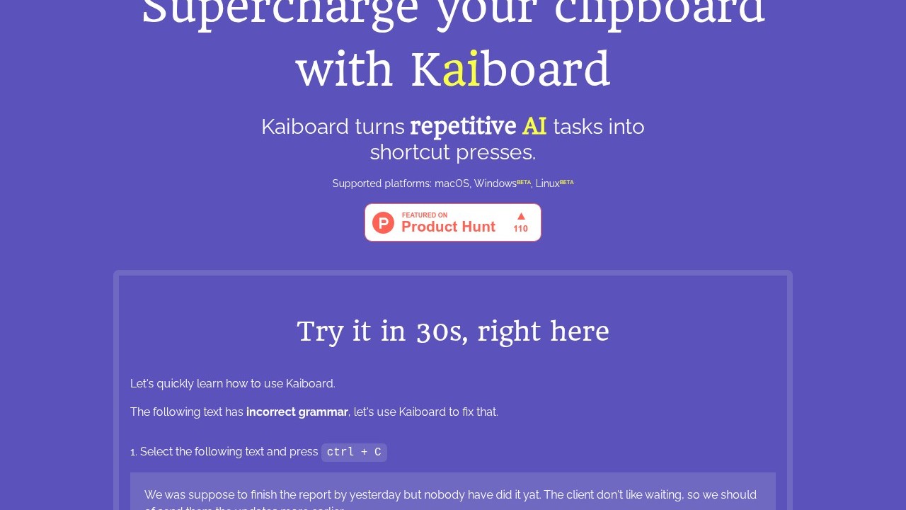 Kaiboard is a clipboard utility that streamlines repetitive text-related tasks using shortcuts. It enables users to efficiently conduct grammar checks, proofreading, translations, and various AI-powered functions without the need to repeatedly copy and paste text into different applications. The tool is accessible on macOS, Windows, and Linux, providing customizable shortcuts to enhance workflow efficiency. It can be integrated with GPT models for sophisticated text manipulation. Kaiboard caters to individuals and teams that frequently depend on AI-enhanced text editing, simplifying the completion of routine tasks effectively. It offers both personal and enterprise plans with varying token limits.