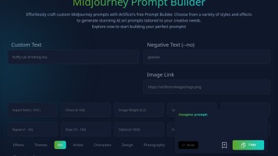 The Midjourney Prompt Builder tool enables users to create personalized text prompts for diverse creative endeavors. Users have the ability to tailor prompts by defining parameters like image links, aspect ratios, chaos levels, image weights, quality, seed numbers, and repetitions, among others. Moreover, users can delve into prompts associated with various eras, art styles, and historical periods, offering a vast array of creative inspiration. This tool serves as a beneficial resource for artists, designers, photographers, and anyone seeking to enhance their creative workflow with distinctive text prompts and thematic concepts.