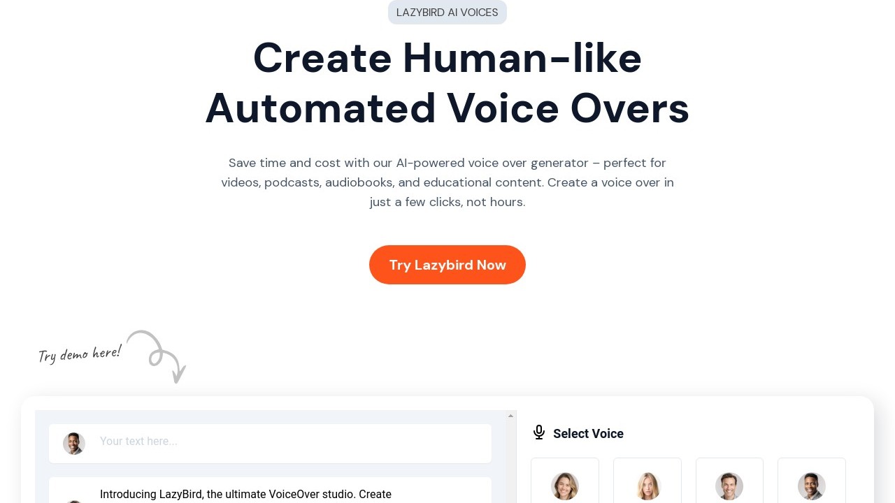 Lazybird is an AI-driven tool for generating voice overs that sound like real human speech, offering a quick and budget-friendly option. It serves a variety of purposes such as enhancing videos, podcasts, audiobooks, TikTok content, educational materials, and phone systems. Users may choose Lazybird to streamline voice recording and production, to acquire a natural voice effect without the need to hire professional voice talents, and to access a diverse selection of voices, accents, and languages to meet various content requirements. Its user-friendly interface, affordable pricing without a mandatory subscription, and detailed control over voice traits make Lazybird an appealing choice for content creators looking for efficiency and high-quality audio output.