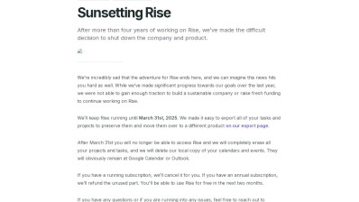 Rise is a calendar application designed to help users make the most of their time and safeguard their focus periods. It includes features like automatically determining optimal meeting times, coordinating with multiple team members, automated cross-calendar blocking, intelligent scheduling links, and additional functionalities. It also features a menu bar for instant access to remaining time and upcoming meetings, as well as a pinboard for a quick overview of team activities.