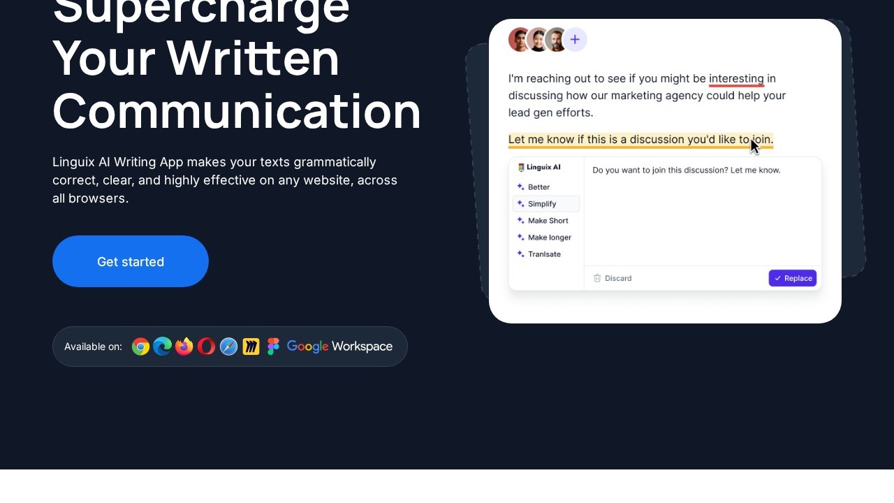 Linguix is an AI-powered writing tool for teams that offers grammar, punctuation, and spelling checks in six languages. It also features text rewriting, content scoring, shortcuts, style guides, and team management. Sales, marketing, and customer support teams can use it to craft clear messages, enhance efficiency, and minimize common writing errors. Additionally, it includes a browser extension to verify content on Gmail, Google Docs, Open.ai, Canva, and millions of other websites.