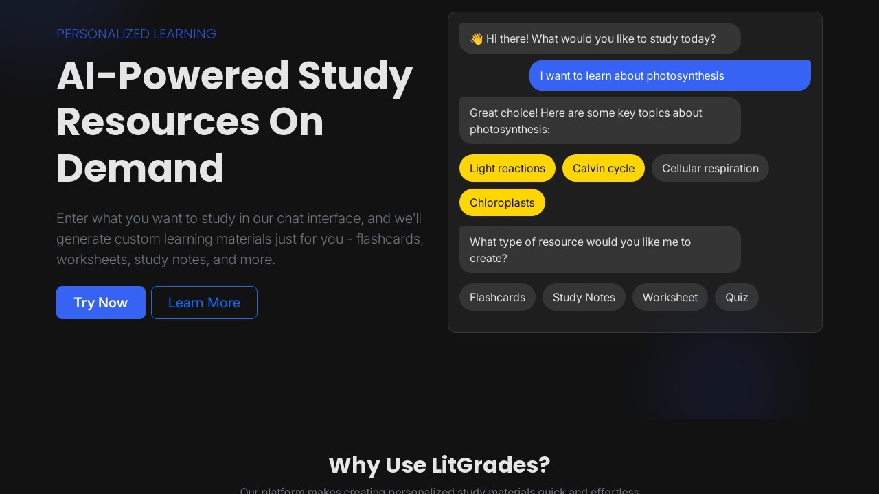 LitGrades is a resource designed to aid students in learning through the use of AI-generated flashcards. These flashcards are customized according to the student's grade level and include subjects like computer basics, BDFB, and anatomy. Additionally, the tool enables students to explore a wider variety of decks.