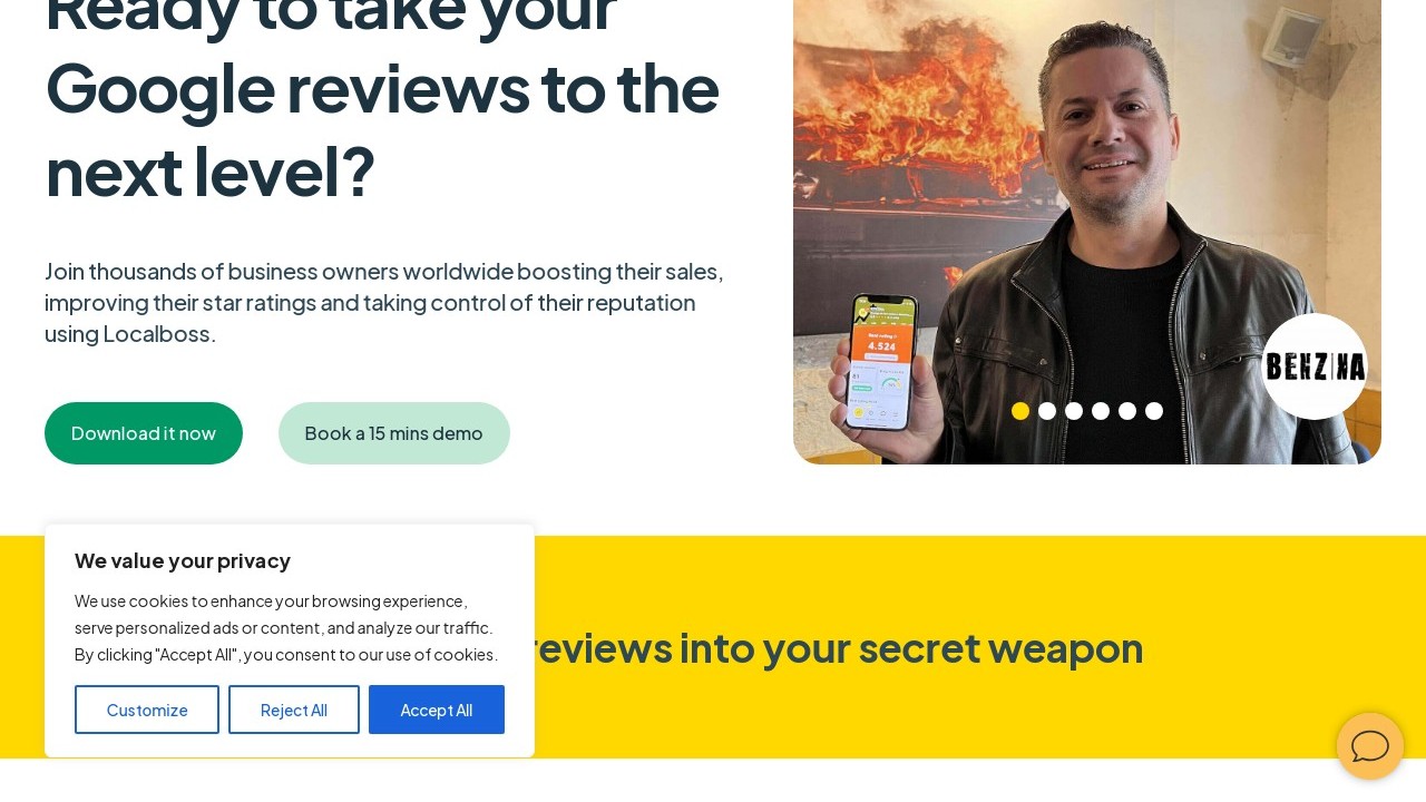 LOCALBOSS is a mobile application created to assist local business owners in easily monitoring, managing, and improving their Google Review Ratings. It offers features such as real-time review tracking, AI-driven response suggestions, customizable templates, and social media sharing, empowering users to control their online reputation and enhance their local SEO. Businesses may consider using LOCALBOSS to amplify the number of positive reviews, promptly address customer feedback, and ultimately elevate their public Google rating, which is vital for drawing new customers and keeping current ones.