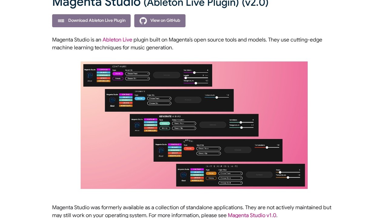 Magenta Studio comprises a set of music plugins driven by Magenta's open-source tools and models. Utilizing machine learning techniques, these tools facilitate music creation and are accessible as both standalone applications and plugins for Ableton Live. Users can read and write clips in Ableton's Session View, as well as read and write files from their file system.