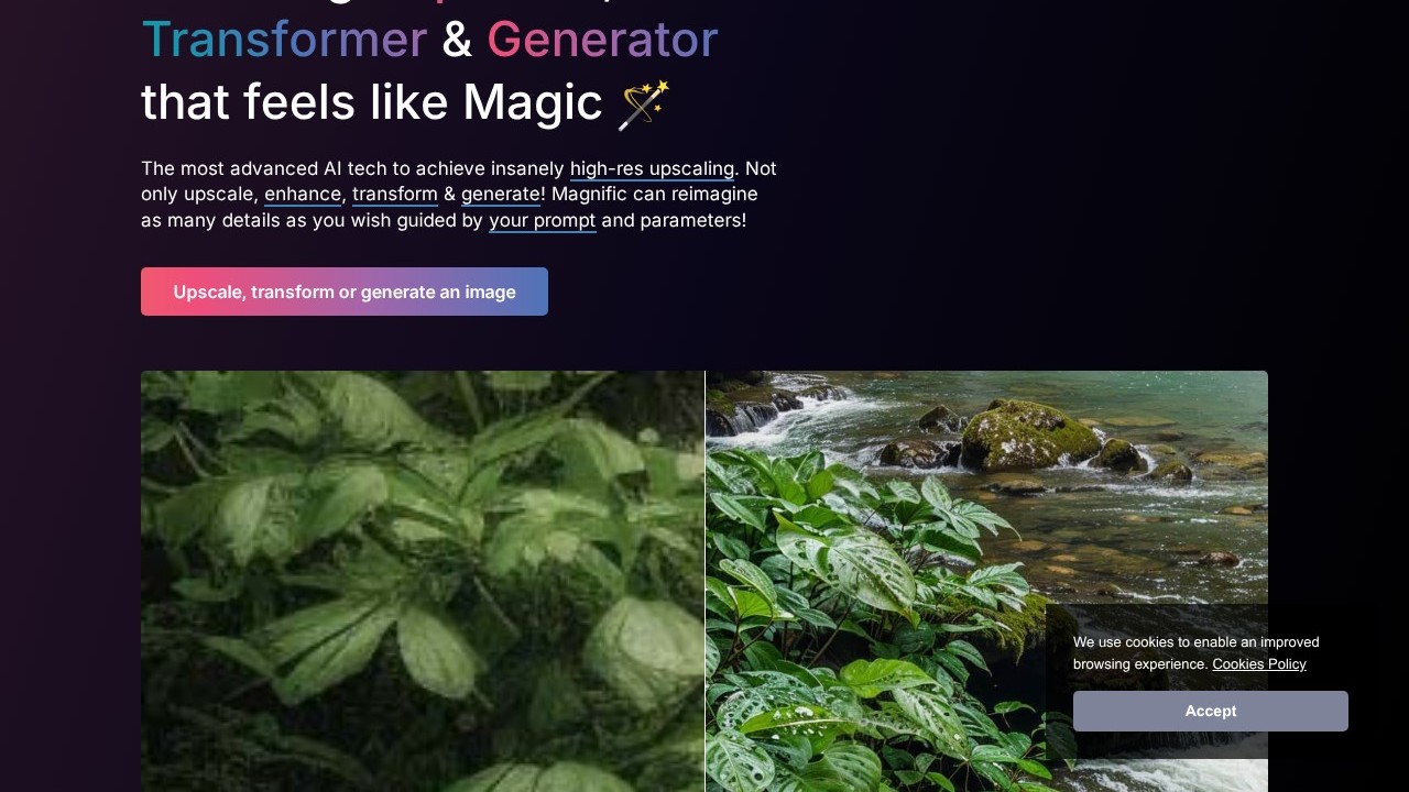 Magnific is an AI-driven tool for enhancing and upscaling images, enabling users to boost the resolution and detail of any picture. By adjusting the "Creativity" slider, it can also introduce additional details. This tool caters to a wide range of users, from photography and graphic design professionals to digital artists and illustrators. A monthly subscription grants access, with secure payment processing provided by Stripe.