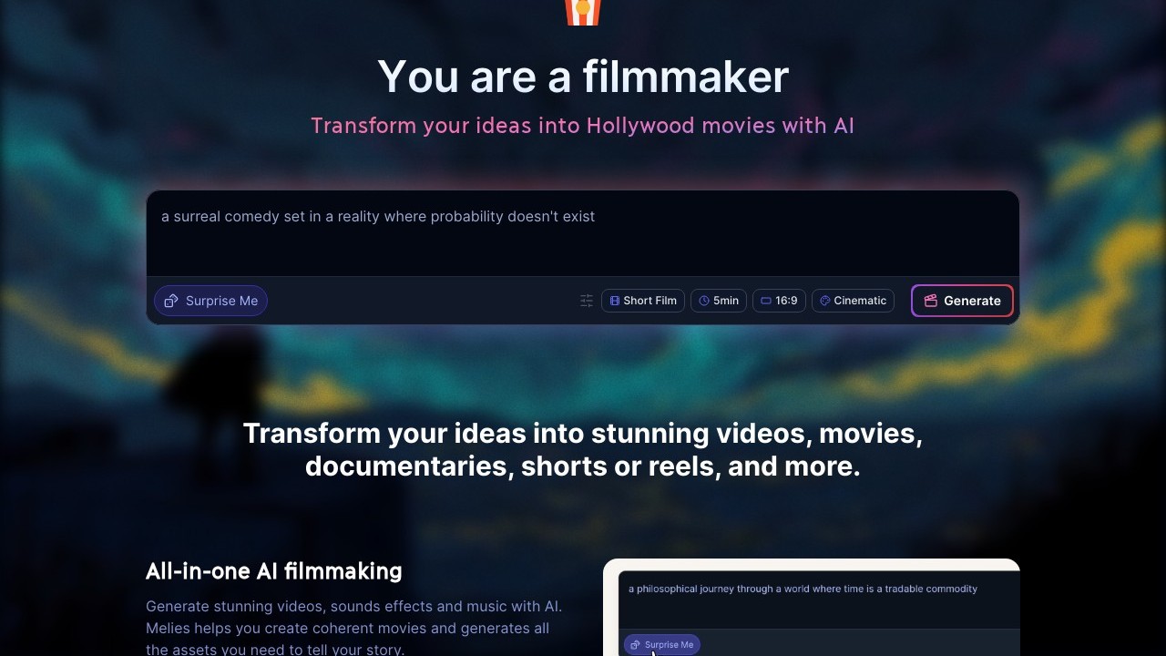 Melies is a filmmaking software powered by AI, providing support throughout various stages of movie production, from brainstorming ideas and writing screenplays to composing music and producing videos. It's tailored for screenwriters, filmmakers, and creatives aiming to enhance their workflow, tackle creative challenges, and generate high-quality content with efficiency. With the integration of cutting-edge AI models, Melies allows users to craft distinctive narratives, develop deep characters, and create audiovisual elements of professional quality, making Hollywood-level filmmaking more attainable for independent creators.