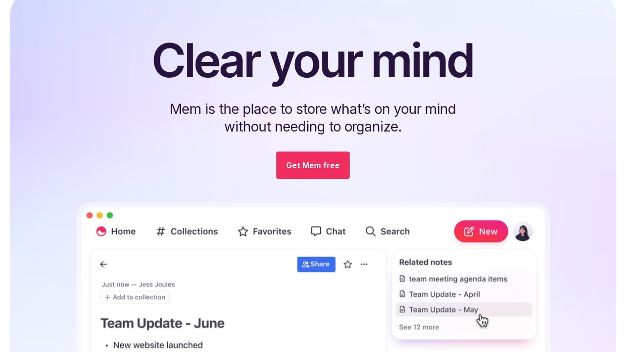 Mem is an AI-driven workspace that self-organizes, assisting individuals and teams in maintaining organization, gathering information from various sources, and automating routine tasks. It offers features such as calendar integration, file attachments, user groups, Zapier integration, task management, imports, flows, native apps, and shared templates to enhance users' ability to capture, organize, and collaborate on their projects. Imagine Evernote or Notion enhanced with intelligent AI capabilities.