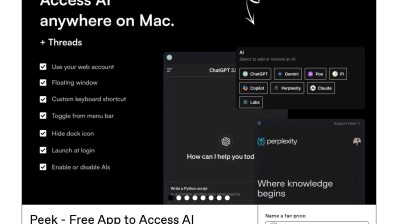 Peek is a MacOS Menu Bar app that lets users engage with various AI chatbots in one location without requiring an API key. It offers an easy-to-use interface for interacting with AI chatbots such as OpenAI's ChatGPT, Google's Bard, and Perplexity AI. Its features include a floating window, stunning screenshots, a menu bar icon, and a dark mode. To install the app, download the latest version and choose your payment amount. It's ideal for developers, writers, students, and anyone curious about AI.