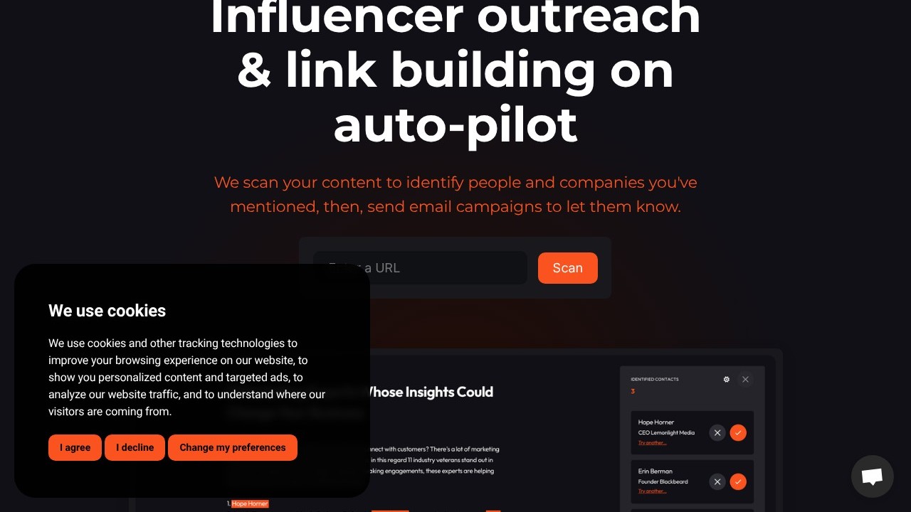A described tool automates outreach efforts and aids in cultivating relationships, increasing brand recognition, and generating backlinks by scanning content for referenced individuals and companies. It also enables users to monitor analytics and view responses within the app. The website provides resources including guides, tools, and a knowledge base to assist users in getting started.