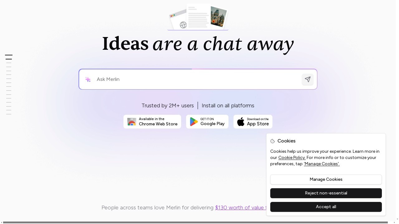 Merlin is an AI assistant accessible through a browser that provides real-time assistance for activities such as summarizing web content, repurposing material, and generating insights without leaving your current tab. It enables users to ask questions and receive answers using context from uploaded documents like PDFs or class notes. With features such as video summary and interactive chat, Merlin aids users in learning more effectively. Its "Projects" feature allows for the creation of reusable knowledge bases, while "Crafts" enables users to make diagrams and charts from text inputs. Additionally, Merlin facilitates rapid prototyping with React and Shadcn snippets, making it valuable in research, education, and development endeavors.