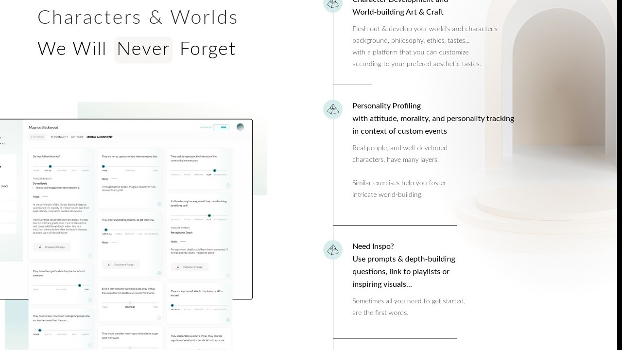 Metos is an instrument created to assist writers, game designers, and visual artists in creating unforgettable characters and intricate settings, cultures, and histories. It offers prompts and questions for depth-building, connects to playlists and inspiring visuals, and features a minimalist editor for easy initiation. Additionally, it provides insights from renowned authors and tools like the Enneagram to comprehend characters' fears, motivations, and core values. Metos is free and does not distribute user data to third parties.