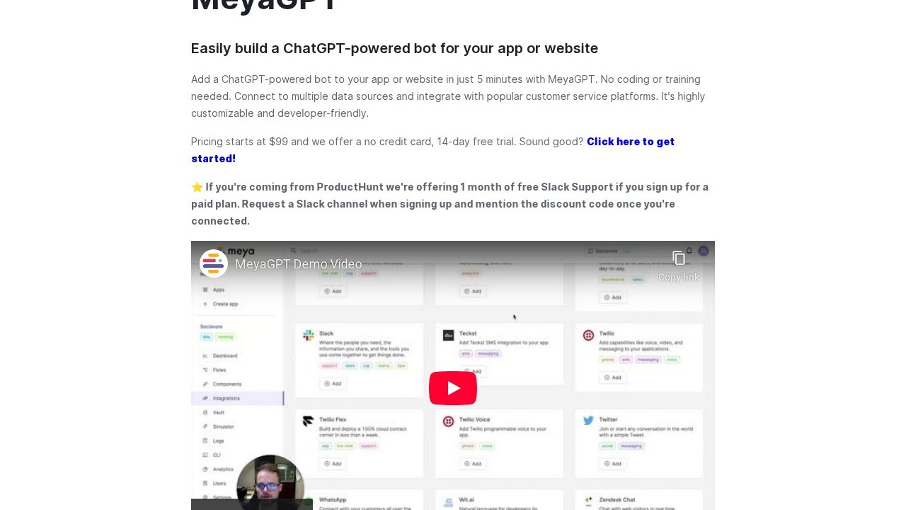 MeyaGPT is a user-friendly platform that enables users to effortlessly integrate a ChatGPT-powered bot into an app or website without the need for coding or training. It connects with various data sources and customer service platforms and is both highly customizable and developer-friendly. A 14-day free trial is available without a credit card, with plans starting at $99.
