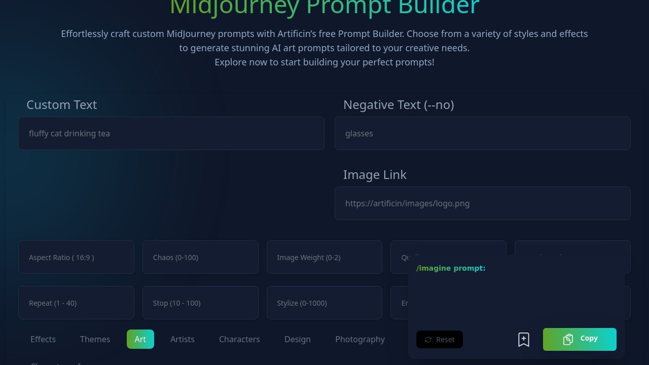 The Midjourney Prompt Builder tool enables users to create personalized text prompts for diverse creative endeavors. Users have the ability to tailor prompts by defining parameters like image links, aspect ratios, chaos levels, image weights, quality, seed numbers, and repetitions, among others. Moreover, users can delve into prompts associated with various eras, art styles, and historical periods, offering a vast array of creative inspiration. This tool serves as a beneficial resource for artists, designers, photographers, and anyone seeking to enhance their creative workflow with distinctive text prompts and thematic concepts.