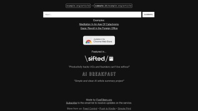 Summate.it is a service designed to swiftly condense web articles with the help of OpenAI. It functions by extracting the complete text from an article and applying OpenAI for summarization. This tool is experimental and not intended for automated use. Due to constraints of the OpenAI API, only a segment of the article might be used for summarization as large text submissions are not permitted.