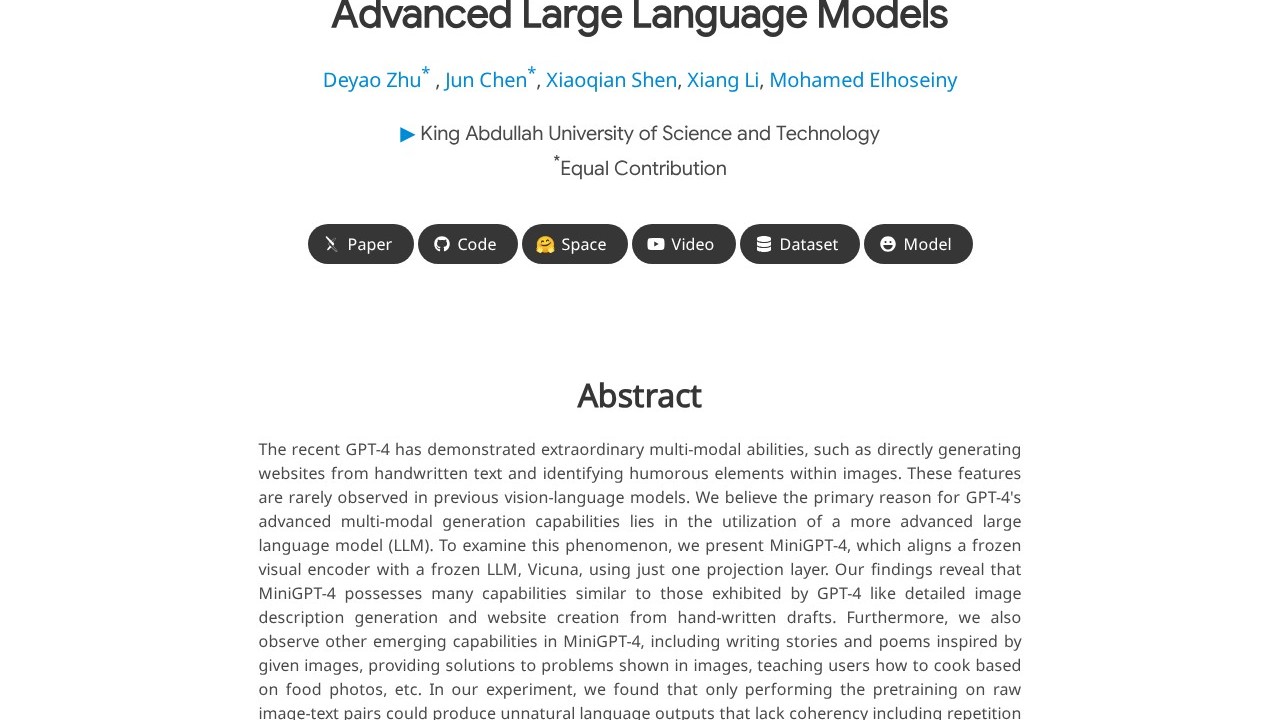 MiniGPT-4 is an instrument that improves vision-language comprehension by merging a fixed visual encoder with a fixed large language model (LLM) through a single projection layer. It can produce comprehensive image descriptions, convert handwritten drafts into websites, compose stories and poems based on provided images, offer solutions to issues presented in images, and instruct users on cooking from photographs of food. MiniGPT-4 is notably computationally efficient, needing only the training of the linear layer to align visual features with Vicuna using around 5 million aligned image-text pairs.