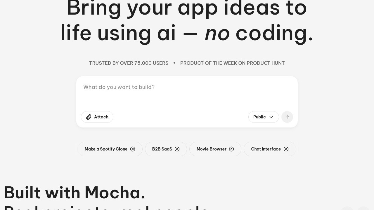 Mocha is an AI-driven, no-code platform for building websites, designed for entrepreneurs. It enables users to swiftly create diverse web applications and sites, including fitness trackers, e-commerce stores, blogs, and SaaS platforms. Prioritizing simplicity, Mocha offers customizable templates and design choices, allowing users to craft professional-quality websites without coding skills. Additionally, it includes a vast selection of pre-made app designs, like portfolio sites, expense trackers, and weather dashboards, making it accessible for individuals and businesses ready to start web projects rapidly.