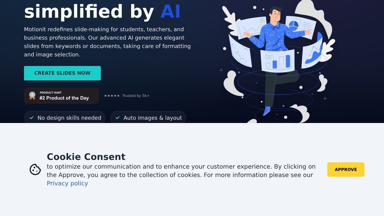 MotionIt.ai produces high-quality slides and videos for pitch decks, conference presentations, and additional uses. Easy process with export options to Google Slides, PowerPoint, and PDF.
