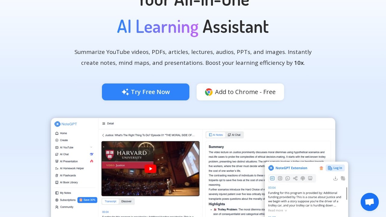 NoteGPT is an AI-driven learning tool developed to boost how efficiently people consume information and study, catering to different kinds of learners. It enables users to swiftly access summaries and overviews of web content, including videos and articles, through AI-crafted summaries, notes, and flashcards. This tool is especially beneficial for those aiming to save time and streamline their learning by transforming large quantities of information into manageable insights. With functionalities such as automatic transcription, note creation, and flashcard generation, NoteGPT is ideal for students, professionals, and anyone aiming to enhance their learning and memory retention. Individuals may find NoteGPT useful for increasing their productivity and learning achievements by effectively handling and summarizing the extensive digital content they come across.