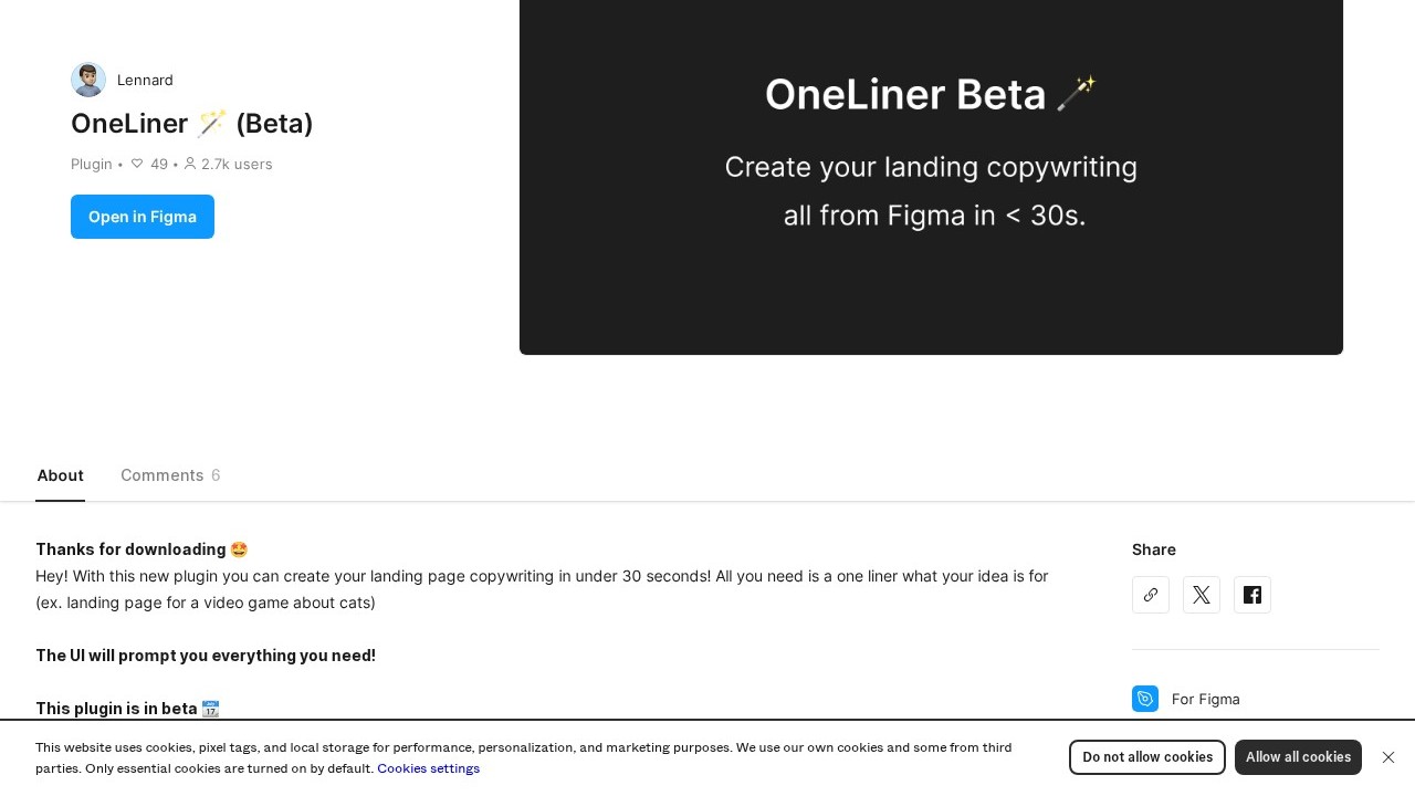 The OneLiner Figma plugin allows users to craft their own landing page copywriting in under 30 seconds. It offers a user-friendly interface that guides users through the process and is currently in beta. The plugin is available for free.