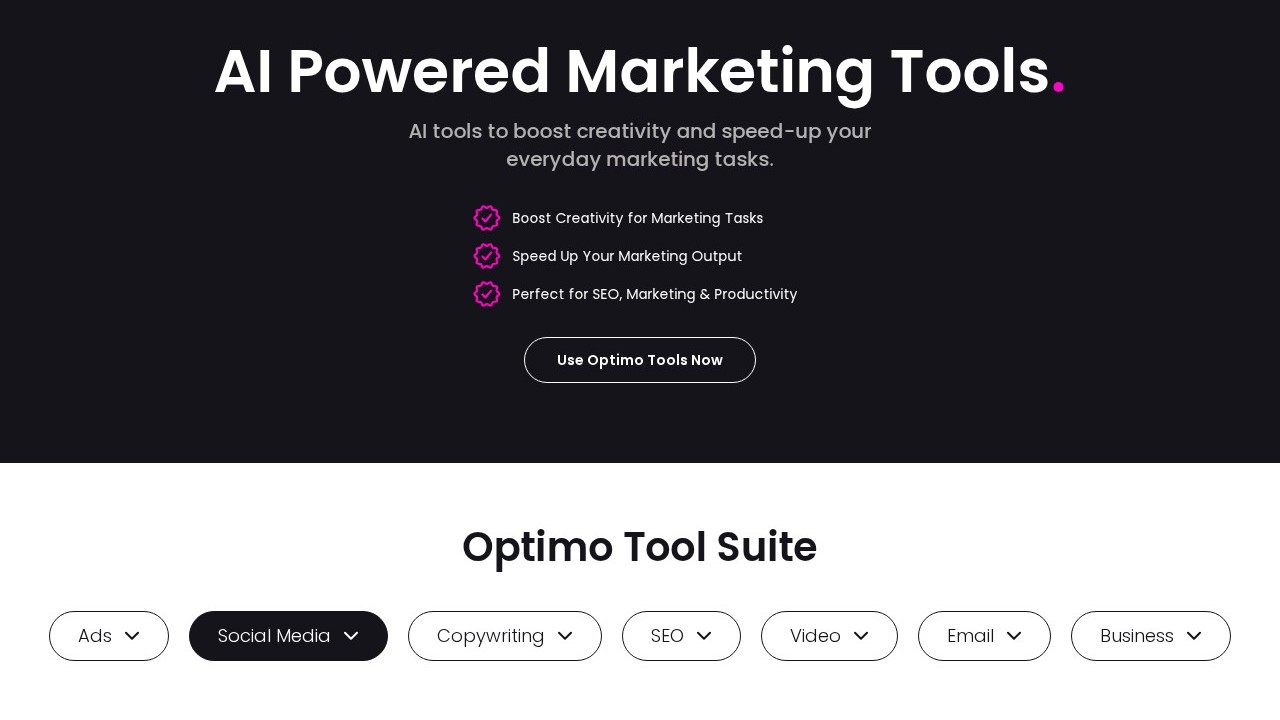 Optimo is a complimentary AI-driven marketing tool designed to help marketers save time and achieve results quickly. It features a range of tools such as Instagram captions, advertisements, copywriting, SEO, video, and email to help marketers efficiently accomplish their marketing tasks. Additionally, it includes well-known tools like blog post titles, keyword clusters, blog post briefs, Facebook ads, and Google ad headlines. Optimo was developed by FATJOE, a platform for on-demand SEO and marketing services.