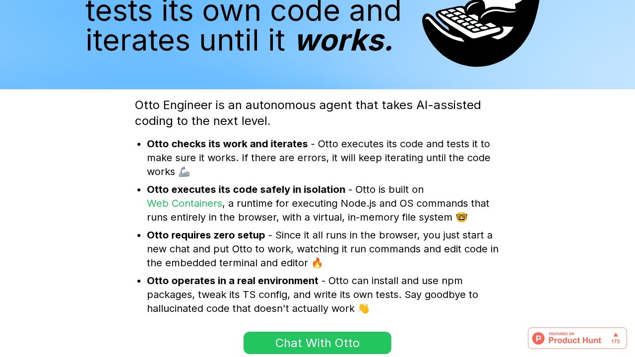 Otto Engineer is an AI-driven coding assistant designed to independently write, test, and iterate code within a browser-based setting, removing the need for setup. It harnesses Web Containers to securely run Node.js and OS commands in isolation, guaranteeing that code functions in a genuine context, not a simulated one. Otto is capable of managing npm package installations, configuring TypeScript, and creating its own tests, making it a valuable asset for developers aiming to accelerate the coding and debugging process, boost productivity, and verify code functionality before deployment. Users may find Otto appealing for its capability to swiftly develop and refine code without the burden of manual testing and environment configuration.