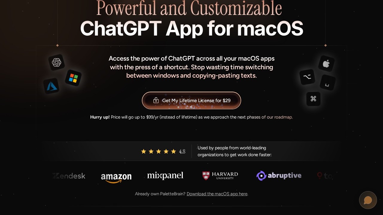PaletteBrain is a Mac app designed to enhance efficiency and productivity. It simplifies workflows by offering customizable templates for various tasks and seamlessly integrates with existing software. Additionally, PaletteBrain enables users to access the OpenAI API key and is available for a one-time purchase, granting lifetime access.