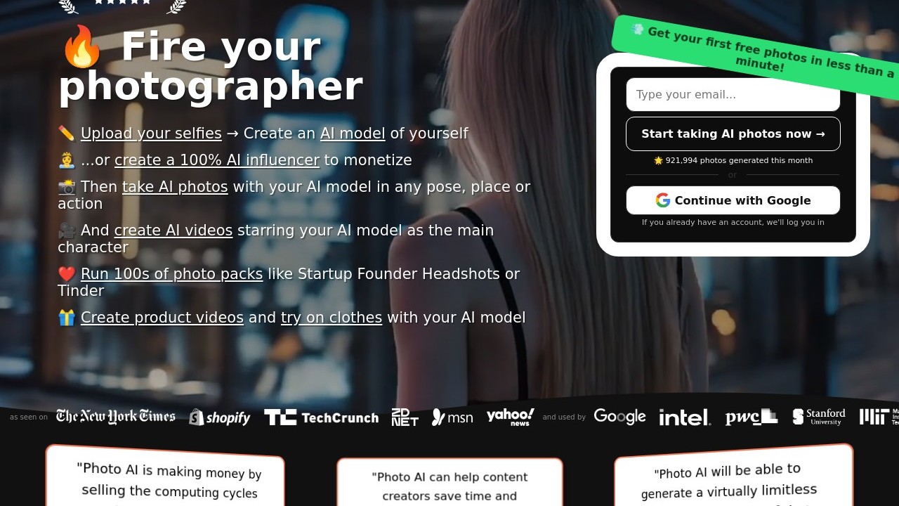 The Photo AI tool functions as an AI photographer, enabling users to train custom models, replicate photos, or organize a photo session. Users have the option to pick models, upload images for replication, and select various elements such as shot style, aesthetics, setting, orientation, mood, age, quantity of photos, and lighting. Additionally, users can upload images to develop their personalized model.