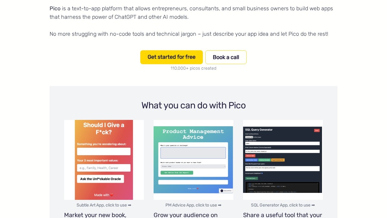 Pico enables users to swiftly create basic, shareable web applications without needing to write any code. It offers access to a collection of 931 picos, which are ready-made code snippets for fast and easy app creation. Additionally, users can request the development of custom applications from the ground up.