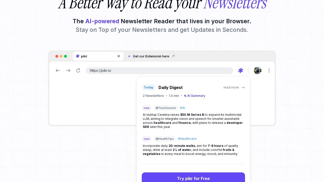 Pikr is a productivity application designed to automate the handling of newsletters and integrate knowledge efficiently. It arranges newsletters found in your email, sends AI-created summaries to your Notion workspace, and simplifies the consumption of information. Individuals might opt for Pikr to tidy up their inboxes, save time by rapidly grasping essential details, and effortlessly merge newsletter content into their current knowledge framework. This tool is especially beneficial for professionals and knowledge workers who are subscribed to numerous newsletters and wish to enhance their information management methods.