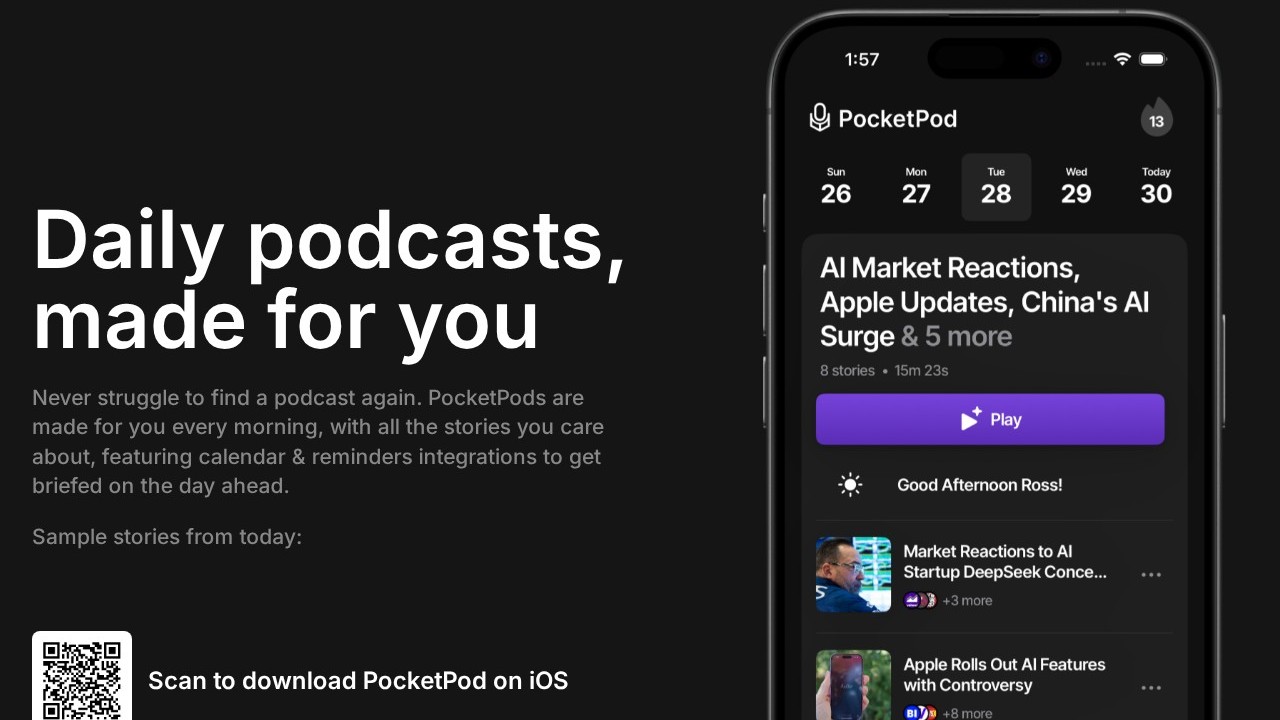 PocketPod is a customized podcast platform that adapts content to each listener's preferences, providing tailored podcasts on demand. Whether users have an interest in current news, niche topics such as feudal Japanese cuisine, or transforming PDFs into audio files, PocketPod creates podcasts that align with their specific interests. It allows users to generate podcasts on any topic or start listening to a curated playlist, thus removing the hassle of searching for pertinent content. This service caters to individuals seeking a more unique listening experience, ensuring they remain informed or entertained with content that appears personally made for them. Equipped with features like daily personalized news podcasts and compatibility with major podcast applications via an RSS feed, PocketPod delivers an accessible and personalized audio journey.