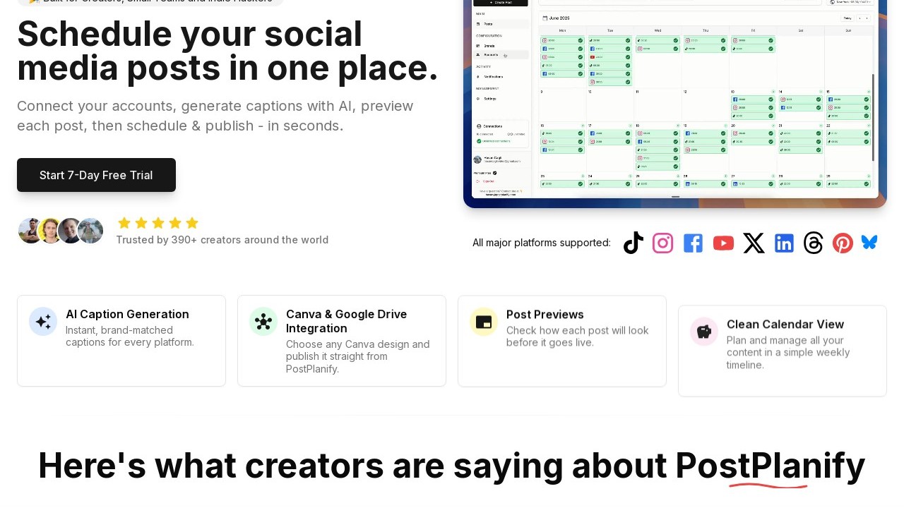 PostPlanify is an AI-driven tool for scheduling social media content, targeted at creators and small teams for managing posts on various platforms. It allows users to link their accounts, create brand-specific captions with AI assistance, preview, and publish posts from one centralized dashboard. The platform seamlessly integrates with Canva for easy design access and presents scheduled content in an organized calendar view. Supporting platforms such as Instagram, Facebook, LinkedIn, TikTok, and others, PostPlanify provides a straightforward and budget-friendly workflow from content creation to publishing. It focuses on being affordable, user-friendly, and efficient, making it an ideal solution for efficient social media management.