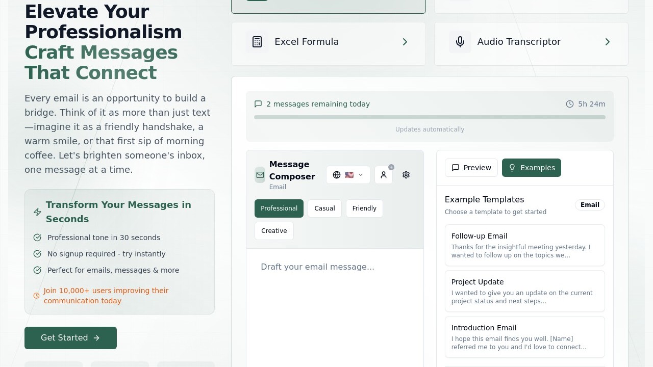 The Professionalize It To Me tool enables users to swiftly create professional emails. It offers 5 complimentary credits daily and has already produced 6,471 messages. Users have the option to duplicate their current message or briefly describe it, choose the type of message, the preferred tone, and the email's language, and then generate their message.