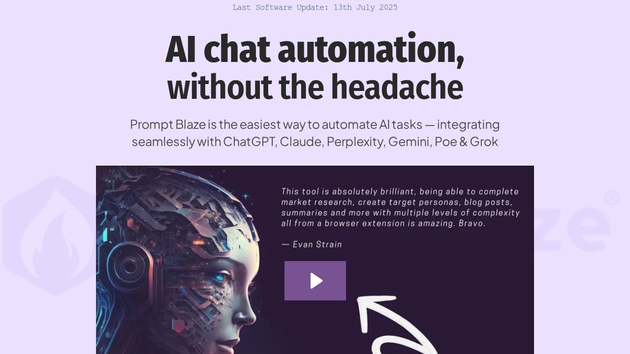 PromptBlaze is a prompt marketplace and AI automation browser extension that allows users to manage, organize, and execute text-based prompts for tools such as Claude, ChatGPT, and Perplexity. Users can save prompts in local browser storage, ensuring full privacy and enabling easy access via a drag-and-drop interface. The extension supports chaining multiple prompts to create intricate, automated workflows, with smooth data transitions between steps. Right-click execution lets users insert highlighted webpage content into workflows instantly, providing adaptable integration with various websites and a streamlined AI-powered productivity experience without the need for coding.
