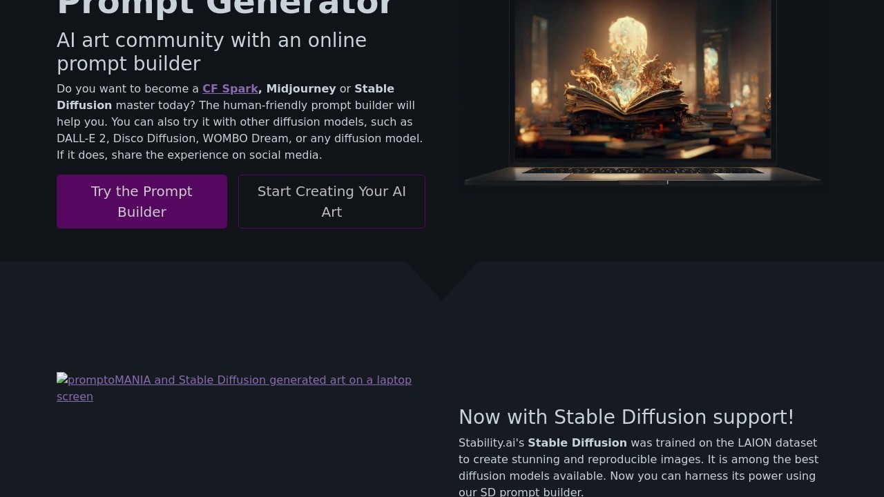 PromptoMANIA is a free AI art community offering an online prompt builder to assist users in mastering CF Spark, Midjourney, or Stable Diffusion. It features a prompt generator, a grid splitter, and an FAQ section to aid in creating high-quality, detailed AI images. The user-friendly prompt builder is ideal for beginners, enabling them to select a diffusion model, input a prompt or image subject, choose a base image, and pick from additional art styles inspired by artists. The grid splitter can divide index images from Midjourney or Stable Diffusion into separate pictures that can be saved.