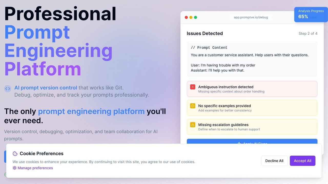 Promptve is an all-inclusive platform that simplifies the management and deployment of AI prompts, allowing users to design, test, refine, and work together on prompts with various AI providers from a single dashboard. This tool aids companies, developers, and content teams in effectively expanding their AI operations by standardizing prompt engineering processes, monitoring performance indicators, and keeping track of successful prompt versions. Companies utilize Promptve.io to remove the inefficiencies of dispersed prompt development, guarantee uniformity in AI results, and optimize their investment returns in generative AI technologies.