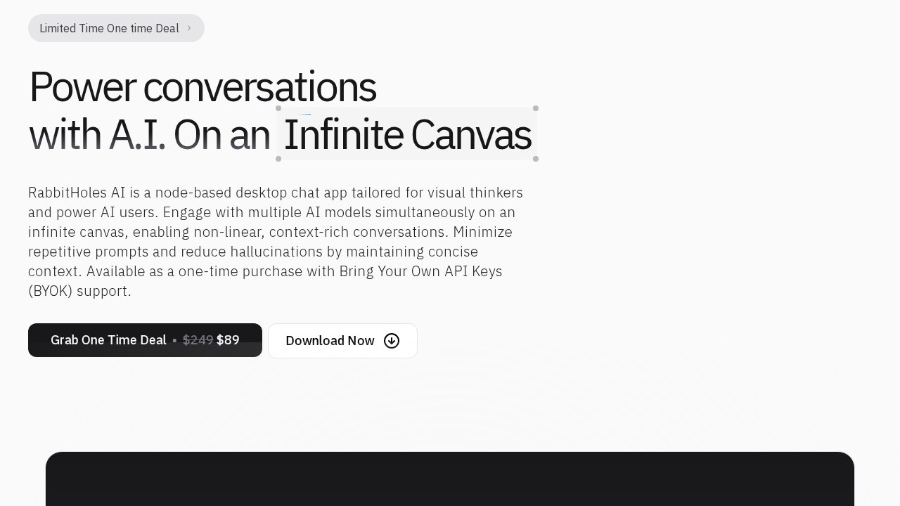 RabbitHoles is an app utilizing AI technology, crafted for experienced users to have extensive, explorative dialogues with AI on a limitless canvas. It enables users to create boards, initiate chats, and develop conversation threads by branching into subtopics or detailed tangents, ensuring deeper and more organized idea exploration. By retaining the conversational context, the app reduces AI hallucinations and boosts productivity for developers, students, researchers, and those in knowledge-intensive roles. Users can switch between AI models to receive customized responses, save their progress locally, and use spatial reasoning for quicker learning and discovery. RabbitHoles is available through a one-time purchase, offering lifetime access.