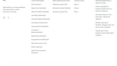 The Teacherbot tool is a versatile resource that enables educators to design activities and plans for any subject and grade level, constrained only by their creativity. It offers materials like literacy, future planning, mathematics, nursery, primary, secondary, and university resources, along with support and contact details. The tool aims to assist teachers in saving time, ensuring they can be home for dinner.