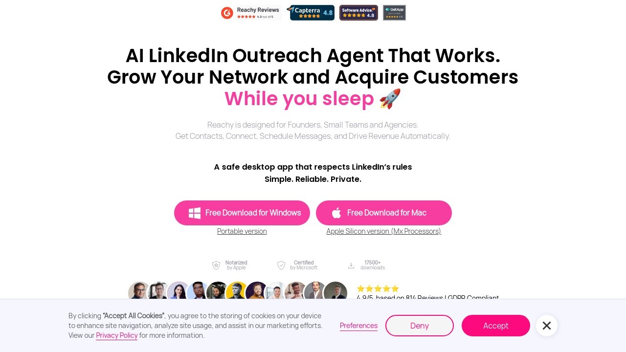 Reachy is a LinkedIn automation tool powered by AI, crafted to assist users in broadening their professional connections, acquiring clients, and generating leads effortlessly. It streamlines outreach by leveraging different triggers, such as registrations for LinkedIn events, group memberships, post engagements, and following competitors. In contrast to potentially hazardous browser extensions, Reachy functions as a secure desktop application compatible with both Mac and Windows, ensuring user privacy and adherence to regulations. It complies with GDPR, is trusted by thousands, and receives high marks for its efficiency in outreach and business growth. Reachy offers a proficient solution for professionals seeking to enhance their LinkedIn interactions and cultivate valuable relationships.