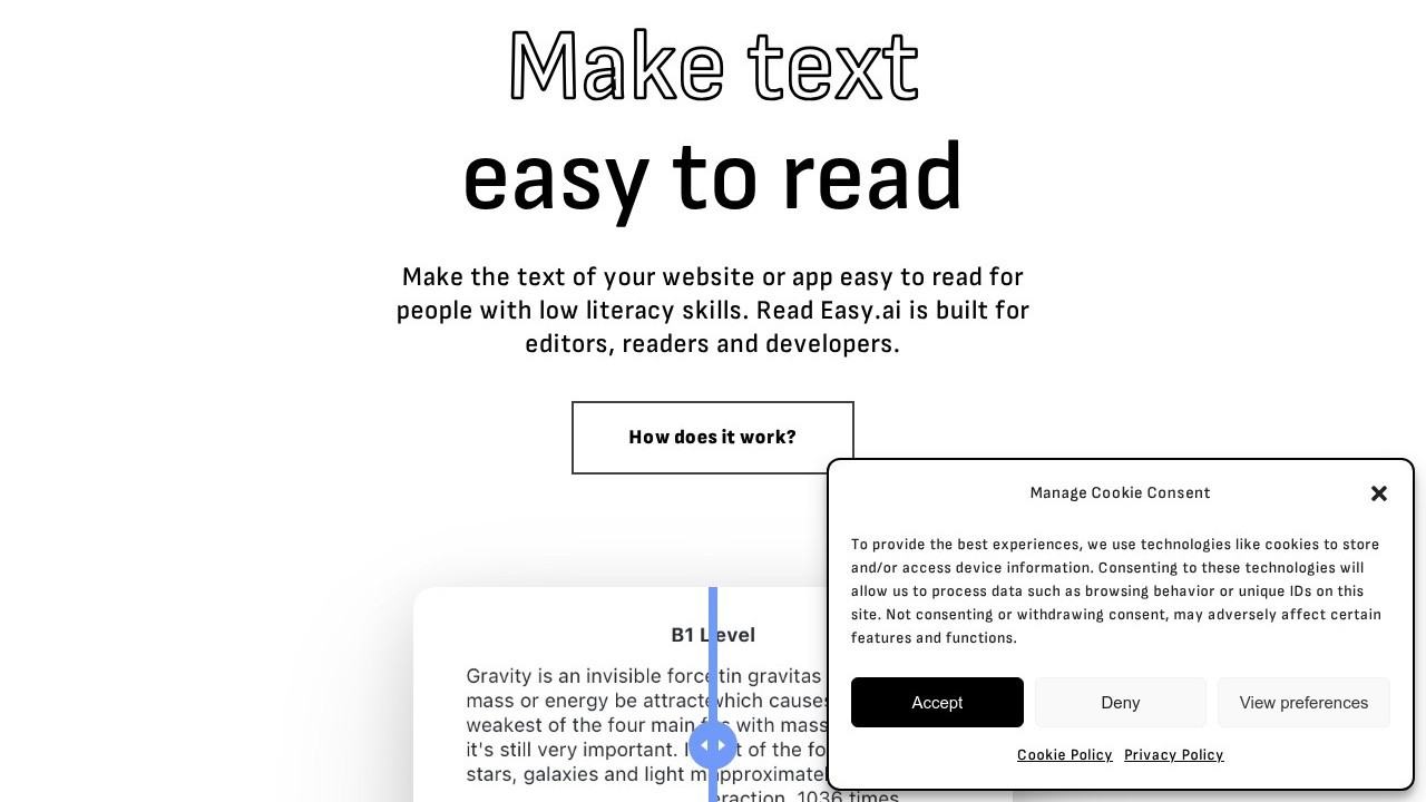 The Read Easy.ai tool is crafted to assist individuals with limited literacy skills by making text more accessible. It simplifies content and supports various languages, such as English, Spanish, German, Dutch, and Portuguese. Offered as an API, the tool integrates with numerous popular platforms and technologies, including React, React Native, Swift, Vue.js, WordPress, and bespoke development solutions. As an editor, you can use Read Easy to verify if your text is simple enough for those with reading disabilities. Additionally, you receive feedback on which words or sentences require modification and the reasons behind their complexity.