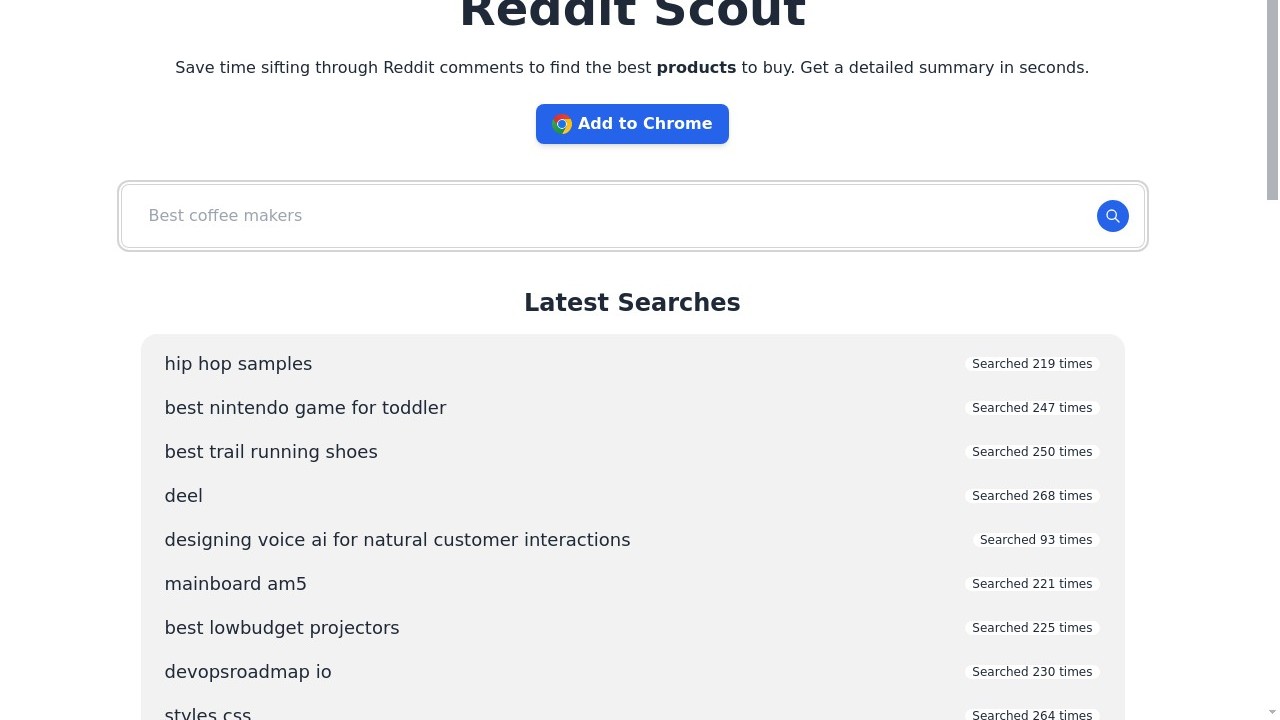 Reddit Scout is an online application created to simplify the search for top-notch product recommendations on Reddit. Users can input a product or type of product to swiftly receive a summarized list of the highest-rated comments from Reddit discussions. This feature saves users the time and effort needed to manually go through multiple threads. Individuals might use Reddit Scout to make well-informed purchasing choices based on the collective insights and reviews from the Reddit community, especially when looking for honest and varied opinions on numerous products.