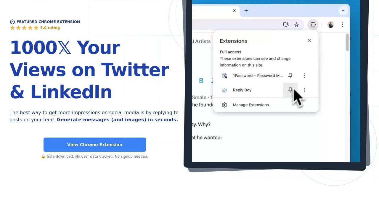 Reply Boy is a safe, privacy-focused Chrome Extension created to assist users in expanding their Twitter presence by offering them creative replies to trending tweets, customized to match their preferred mood. It neither tracks user data nor logs messages, and it doesn't require users to input their 𝕏 password.