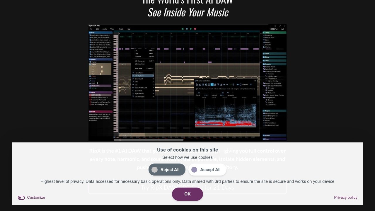 RipX is a software solution designed for extracting vocals, generating stems, mastering and practicing music pieces, remixing tunes, and repairing audio. It includes a 21-day free trial and boasts features like DeepRemix, DeepCreate, and DeepAudio. The tool also allows users to personalize its appearance and interface. It aims to deliver a robust and user-friendly audio processing experience.